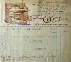 A. Cutler & Son, Buffalo, New York. Number 073-SD, oak desk, $38. Sold February 19, 1900 to T. Eaton & Co., Toronto, Canada.